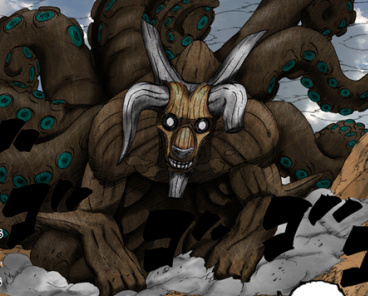Sobre o Bijuu - É um Touro Gigantesco, com 8 caudas em forma de tentáculos (como um Polvo). Possui a habilidade de manipular o elemento Raiton, assim como uma defesa similar ao manto da raposa da Kyuubi após a liberação de algumas caudas. Parece ser mais sociável do que os outros Bijuu's.