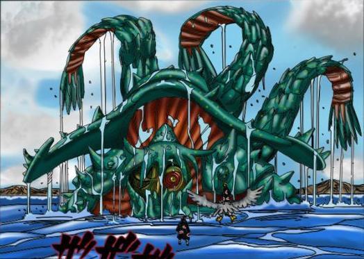 Sobre o Bijuu - É uma espécie híbrida, uma mistura de dois animais diferentes, sendo seu corpo igual a de um cavalo e sua cabeça idêntica a de um golfinho.É capaz de controlar o Katon e a Suiton e de combiná-los para formar um novo elemento, o Yugeton, que consiste na criação e controle de vapores absurdamente quentes.